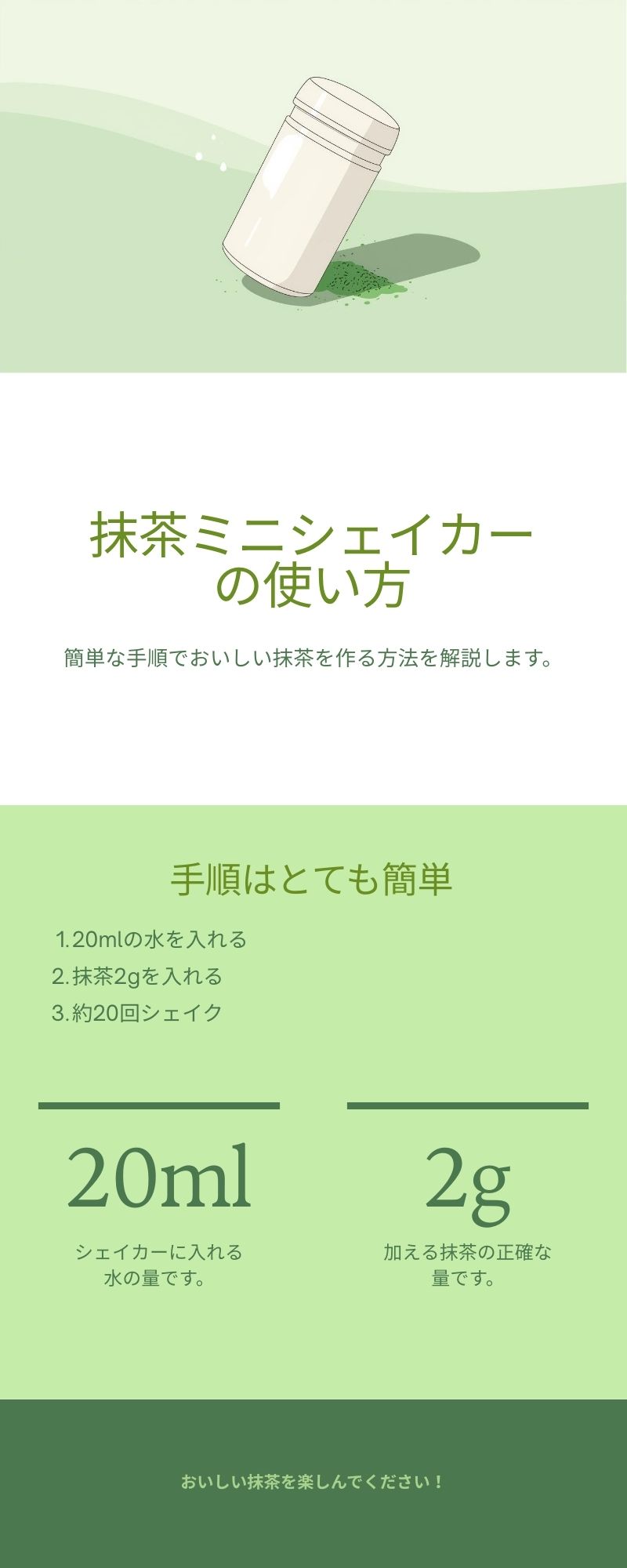 抹茶がダマになりにくい特殊な構造を採用しています。約20ccの水と抹茶を入れて振るだけで、